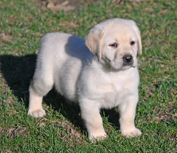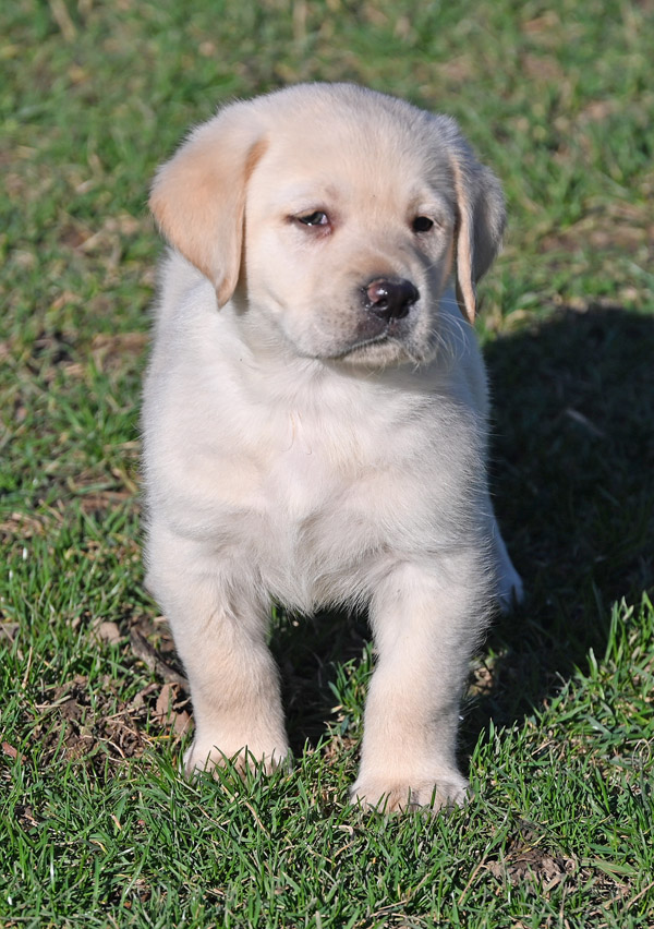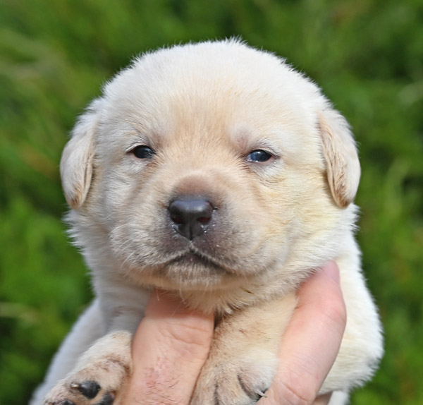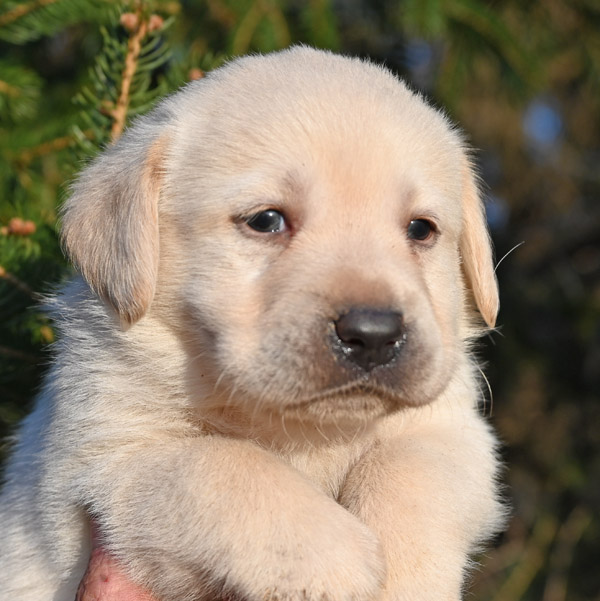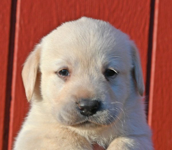 Pictured is the available yellow male pup out of the Norse and Ida litter that was born on 1/28/2026. This pup is available for a new home on March 27th or later. He has a great, happy go lucky temperament. He has very strong English features at this time (square, boxy head, big bone in his body, well muscled). He will continue to grow and mature into a strong English Labrador with a calm, loving temperament like his sire and dam. The shade of yellow on this pup is very light in color, almost white with dark black pigment.