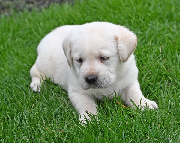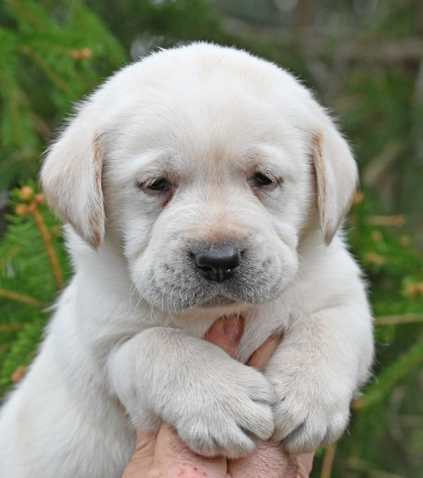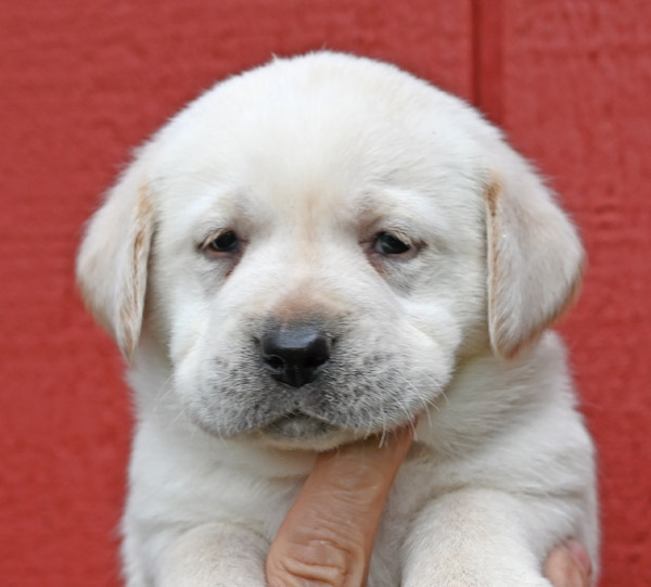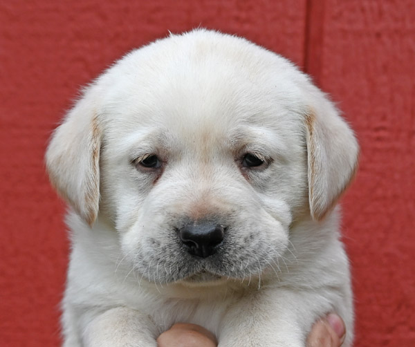 Pictured is the available yellow male pup out of the Norse and Gretta litter that was born on 3/07/2026. This pup is available for a new home on May 2nd or later. He has a great, happy go lucky temperament. He has very strong English features at this time (square, boxy head, big bone in her body, well muscled). He will continue to grow and mature into a strong English Labrador with a calm, loving temperament like his sire and dam. The shade of yellow on this pup is very light in color, almost white with dark black pigment around his eyes and on his nose.