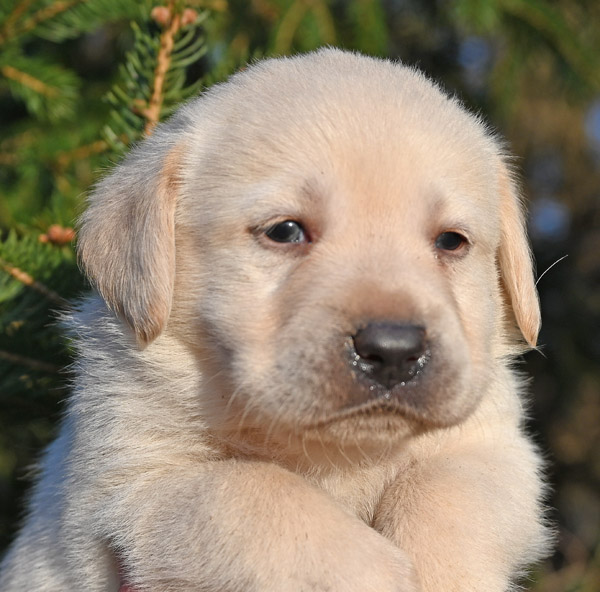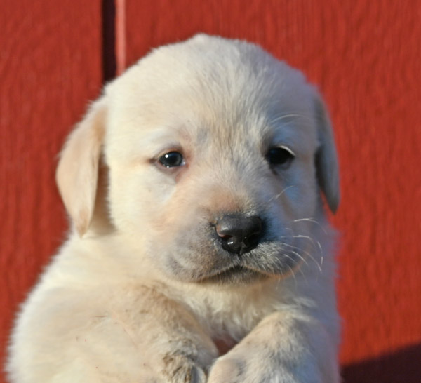Pictured is the available yellow male pup out of the Norse and Ida litter that was born on 1/28/2026. This pup is available for a new home on March 27th or later. He has a great, happy go lucky temperament. He has very strong English features at this time (square, boxy head, big bone in his body, well muscled). He will continue to grow and mature into a strong English Labrador with a calm, loving temperament like his sire and dam. The shade of yellow on this pup is very light in color, almost white with dark black pigment.