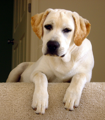Debacle is a light yellow, almost white male Labrador whelped at Amber Sky Labradors on